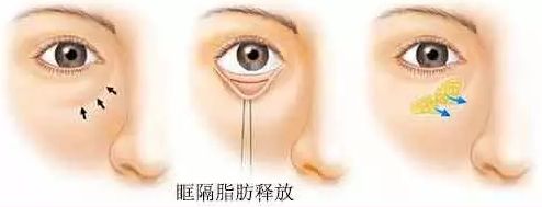 去除眼袋矫正、填充下睑泪沟一举两得,在针对下睑泪沟区明显凹陷者,采用眼袋眶隔脂肪释放术,保留眶脂肪,把眶脂肪填充到下睑泪沟凹陷部位,达到填平下睑泪沟的目的,从而使眼袋矫正术达到一举两得的效果。